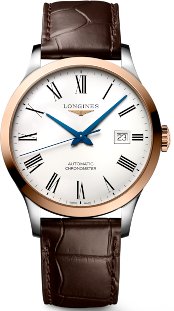 Bộ sưu tập Record của LONGINES là minh chứng cho cam kết không ngừng nghỉ của thương hiệu đối với độ chính xác và sự thanh lịch trong chế tác đồng hồ. Được chế tác tỉ mỉ với sự kết hợp giữa truyền thống và đổi mới, những chiếc đồng hồ tự động này được trang bị lò xo cân bằng silicon. Bộ máy của chúng được chứng nhận đồng hồ bấm giờ bởi COSC. RECORD, L2.821.5.11.2, đồng hồ tự động, Ø 40,00 mm, thép không gỉ và vàng hồng 18 karat nắp 200. Bộ máy cơ tự động lên dây cót, tần số dao động 25.200 vph, với lò xo cân bằng silicon đơn tinh thể, dự trữ năng lượng lên đến 72 giờ. Khả năng chống nước ở độ sâu 3 bar, mặt kính sapphire chống trầy xước, với nhiều lớp phủ chống phản quang ở mặt dưới. Mặt số màu trắng mờ. Dây đeo bằng da cá sấu, với khóa gập an toàn ba lớp và cơ chế mở bằng nút bấm. Hình dạng Tròn. Chất liệu Thép không gỉ và vàng hồng 18 karat nắp 200. Mặt kính sapphire chống trầy xước, với nhiều lớp phủ chống phản quang ở mặt dưới. Mặt sau trong suốt với tinh thể sapphire. Kích thước 40,00 mm. Khoảng cách vấu 20 mm. Khoảng cách vấu-với-vấu 49,60 mm. Độ dày 10,80 mm. Chống nước ở áp suất 3 bar. Trọng lượng 73,4 g. Màu mặt số Trắng mờ. Vạch chỉ giờ Số La Mã được sơn. Kim Kim thép xanh. Loại chuyển động Tự động. Chức năng Giờ, phút, giây và ngày. Calibre L888.4. Chuyển động cơ học tự lên dây cót với tần số 25'200 dao động mỗi giờ, với lò xo cân bằng silicon đơn tinh thể dự trữ năng lượng lên đến 72 giờ. Chất liệu Dây đeo cá sấu. Màu nâu. Khóa Với khóa gập an toàn ba lần và cơ chế mở bằng nút bấm.
