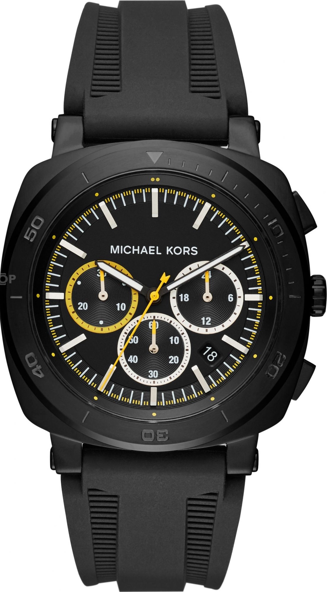 - Mặt đồng hồ bấm giờ màu đen với các cọc số màu trắng, ba kim, ba mặt số phụ, cửa sổ ngày và Michael Kors