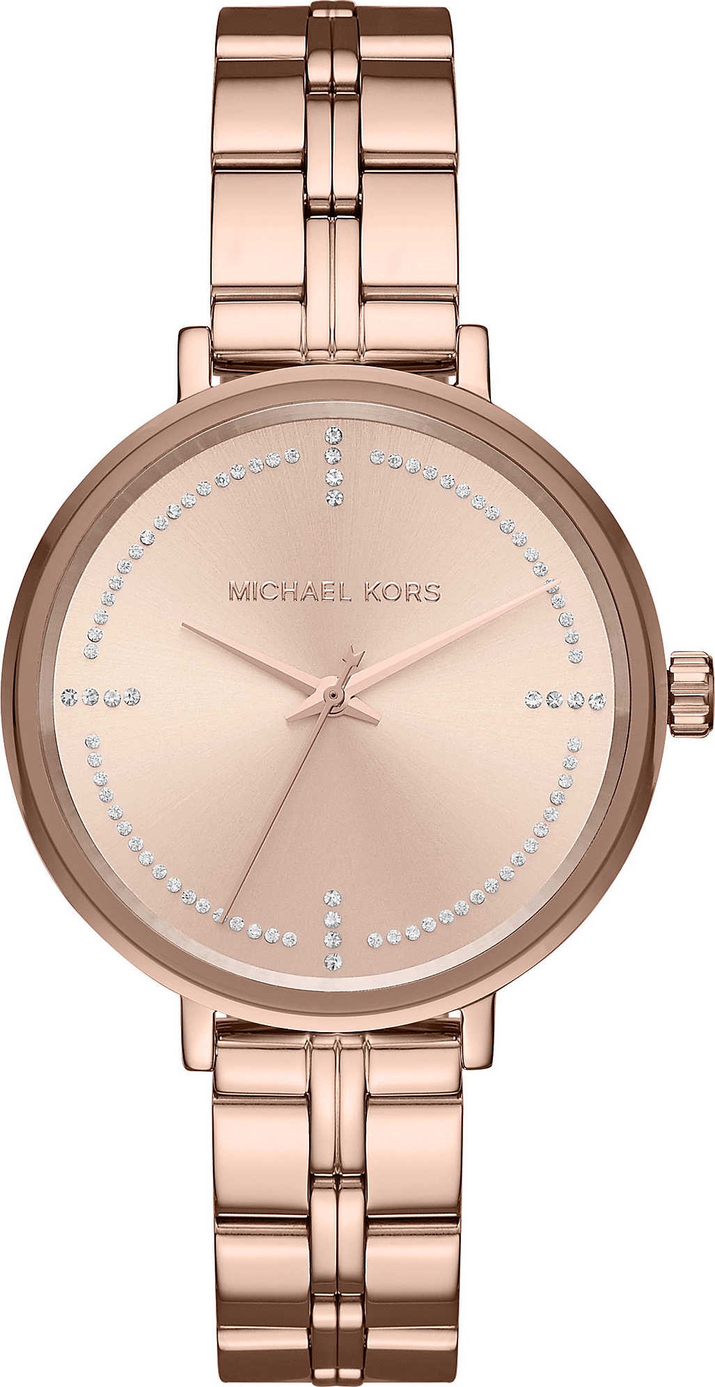 Chiếc đồng hồ Michael Kors Bridgette này có mặt số tia nắng màu vàng hồng được trang trí bằng pavé, vỏ màu vàng hồng và hoàn chỉnh với dây đeo ba mắt xích được đánh bóng.