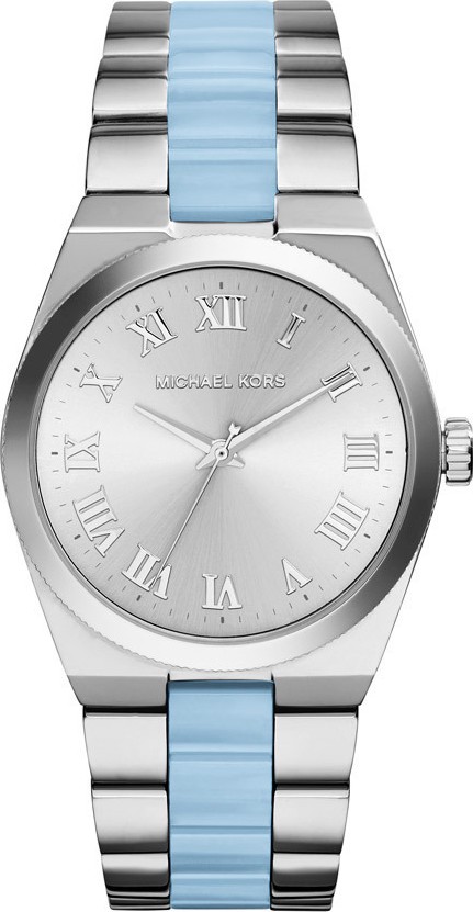 Chiếc đồng hồ Channing này của Michael Kors dựa trên thiết kế cổ điển với chữ số La Mã và thép đánh bóng, trong khi đường chambray mềm mại mang đến vẻ ngoài hiện đại hơn.