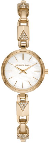 Đồng hồ Jaryn Mercer 24mm của Michael Kors có mặt số xà cừ màu trắng với các cọc số tông vàng, chuyển động hai tay và vòng tay khóa Mercer bằng thép không gỉ tông vàng với các chi tiết lấp lánh
