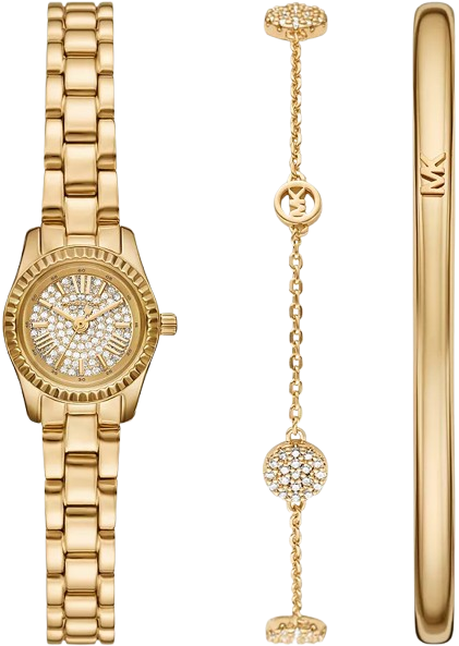Một món quà vượt thời gian với vẻ đẹp quyến rũ tự nhiên. Bộ sưu tập được tuyển chọn này bao gồm đồng hồ Micro Lexington với mặt số pavé lấp lánh, kết hợp với dây đeo kim loại pavé disc station và vòng tay dạng vòng tay thanh mảnh. Hoàn hảo để xếp chồng hoặc đeo riêng lẻ, bộ ba này mang đến bữa tiệc cánh tay tuyệt đỉnh—lý tưởng để làm quà tặng hoặc nâng tầm phong cách hàng ngày của riêng bạn. Kích thước vỏ: 19MM. Bộ máy: Thạch anh ba kim. Nền tảng: LEXINGTON. Chất liệu dây đeo: Thép không gỉ. Màu dây đeo: Vàng. Khả năng chống nước của vỏ: 5 ATM. Chất liệu vỏ: Thép không gỉ. Màu vỏ: Vàng. Màu mặt số: Vàng, Pave. Chiều rộng dây đeo: 10MM. Khóa: Khóa gập 2 nút bấm. Chu vi bên trong dây đeo: 185 +/- 5MM. Loại tinh thể: Khoáng sản. Loại pin: 379. Chi tiết sản phẩm bổ sung: Vòng đeo tay dạng xích: Khóa: Chốt tôm hùm, Màu chính: Tông vàng, Chất liệu chính: Đồng thau, Kích thước: Chiều dài: 190mm, Chiều rộng: 5,8mm Vòng đeo tay dạng vòng: Màu chính: Tông vàng, Chất liệu chính: Đồng thau, Kích thước: Chiều dài: 179mm, Chiều rộng: 4mm