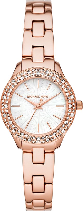 Vỏ và dây đeo bằng thép không gỉ tông vàng hồng. Vành bezel cố định tông vàng hồng đính pha lê. Mặt số màu trắng với kim và vạch chỉ giờ tông vàng hồng. Số La Mã. Kiểu mặt số: Analog. Bộ máy thạch anh. Tinh thể khoáng chống xước. Núm vặn kéo/đẩy. Nắp lưng chắc chắn. Hình dạng vỏ tròn. Kích thước vỏ: 28 mm. Độ dày vỏ: 8 mm. Chiều rộng dây đeo: 12 mm. Khóa gập có chốt an toàn. Chống nước ở độ sâu 50 mét / 165 feet. Chức năng: giờ, phút, giây. Dòng Liliane. Kiểu đồng hồ đeo tay.
