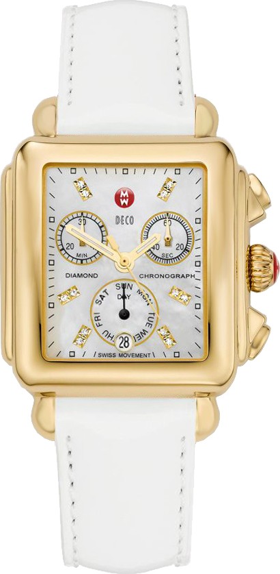 Mười hai viên kim cương lấp lánh đánh dấu giờ trên chiếc đồng hồ Deco mạ vàng này. Bộ máy đồng hồ bấm giờ Thụy Sĩ cùng với các điểm nhấn đặc trưng của MICHELE hoàn thiện vẻ ngoài. Dây đeo bằng da sáng chế màu trắng có thể thay thế được với bất kỳ dây đeo MICHELE 18mm nào.
