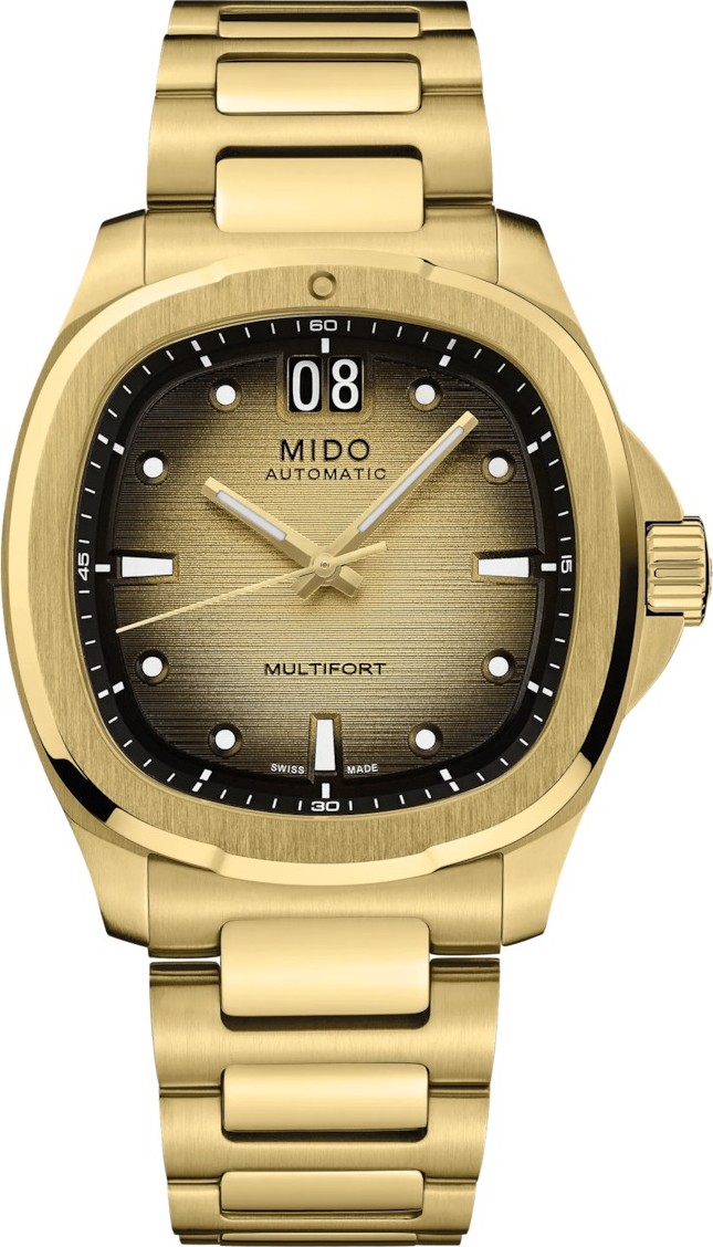 Một sự trở lại ngoạn mục! Được thừa hưởng từ di sản phi thường của MIDO, vỏ đồng hồ hình TV trở lại vị trí trung tâm trong chiếc Multifort TV Big Date, mạnh mẽ và chính xác nhờ bộ máy cơ khí mạnh mẽ. Thiết kế hiện đại và năng động của chiếc đồng hồ Thụy Sĩ này được làm nổi bật bởi mặt số ấn tượng và chức năng đặc biệt: hiển thị ngày lớn ở vị trí 12 giờ. Bộ máy tự động thế hệ mới nhất mạnh mẽ, Caliber 80, được trang bị lò xo cân bằng công nghệ cao bằng Nivachron™, mang lại khả năng chống sốc và từ trường vượt trội. Bộ sưu tập Multifort. Khả năng chống nước 10 bar (100 m / 330 ft) với núm vặn. Trọng lượng (g) 155. Hình dạng vỏ Hình chữ nhật. Chất liệu vỏ Thép không gỉ với lớp phủ PVD màu vàng. Mặt kính Sapphire với lớp phủ chống phản chiếu hai mặt. Tùy chọn vỏ Mặt sau trong suốt, Núm vặn. Chiều dài vỏ (mm) 39.20. Chiều rộng (mm) 40.00. Độ dày trung bình (mm) 11.5. Chiều rộng càng (mm) 22.00. Màu mặt số Màu sâm panh. Bộ máy MIDO Automatic ETA. Chức năng Ngày lớn. Dự trữ năng lượng Dự trữ năng lượng lên đến 80 giờ. Mã dây đeo/dây xích M605019694. Chi tiết dây đeo Thép không gỉ. Màu dây đeo Khóa cài mạ vàng. Khóa gập.