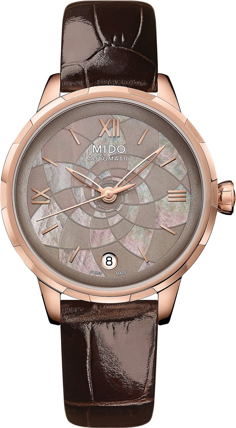 Da nâu chất lượng hàng đầu và thép không gỉ tông vàng hồng mang đến khung cảnh sang trọng cho mặt số khảm xà cừ nghệ thuật của chiếc đồng hồ trong bộ sưu tập Rainflower độc quyền này của Mido.