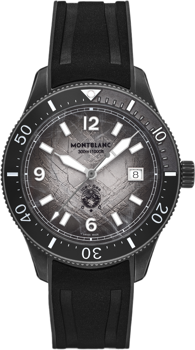 Chiếc đồng hồ Montblanc Iced Sea Automatic Date 0 Oxygen với mặt số họa tiết sông băng xám mờ tạo ấn tượng như đang nhìn vào sâu thẳm của một sông băng. Lấy cảm hứng từ Mer de Glace (Biển Băng), kết cấu sông băng này được tạo ra bằng kỹ thuật cổ truyền gần như bị lãng quên gọi là gratté-boisé. Chiếc đồng hồ được đặt trong vỏ thép mài mòn 41 mm hoàn toàn không có oxy và đi kèm với vòng bezel xoay một chiều với lớp gốm đen được hạ thấp bằng laser từ 0-15 phút, khắc 3D ở mặt sau vỏ và dây đeo cao su đen có thể thay thế với hệ thống điều chỉnh tinh tế. Chiếc đồng hồ tuân thủ tiêu chuẩn ISO 6425 dành cho lặn biển và có khả năng chống nước ở độ sâu 300 mét. Loại máy: Máy tự động. Giờ - Phút - Giây - Ngày. Chức năng: Ngày bằng đĩa. Đường kính vỏ: 41 mm. Chiều cao vỏ: 12,9 mm. Chống nước: 30 bar. Chống nước: 300 mét. Vòng bezel: Vòng bezel xoay một chiều. Núm chỉnh giờ dạng vít xoắn, có rãnh, làm bằng thép không gỉ mài mòn với biểu tượng Montblanc dập nổi. Mặt số màu xám mờ họa tiết băng hà, các chữ số Ả Rập và vạch chỉ giờ được phủ rhodium phát quang màu trắng. Chiều rộng càng đeo 20 mm.