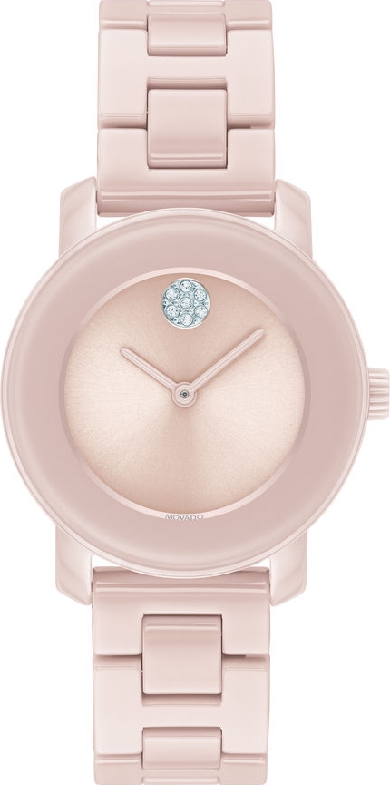 Movado SOL, vỏ gốm màu đỏ hồng 30 mm với mặt số tông màu đỏ trên vòng đeo tay liên kết bằng gốm màu hồng.