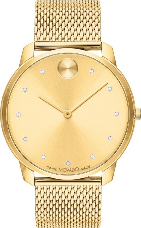 Vỏ thép không gỉ IP màu vàng vàng với vòng đeo tay bằng lưới thép không gỉ IP màu vàng vàng. Viền cố định bằng thép không gỉ IP màu vàng vàng. Mặt Số Vàng Với Kim Màu Vàng Và Vạch Giờ Pha Lê. Dấu chấm Movado xuất hiện ở vị trí 12 giờ. Loại quay số: Analog. Phong trào thạch anh. Pha lê K1 chống trầy xước. Vương miện kéo/đẩy. Ốp lưng chắc chắn. Hình dạng vỏ tròn, Kích thước vỏ: 42 Mm. Khóa trượt. Chống nước ở độ cao 30 mét / 100 feet. Chức năng: Giờ, Phút. Chuỗi tiến hóa táo bạo. Phong cách đồng hồ ăn mặc. Nhãn đồng hồ: Swiss Made. Đồng hồ nam mặt số vàng pha lê Movado Bold Evolution Quartz 3600903.