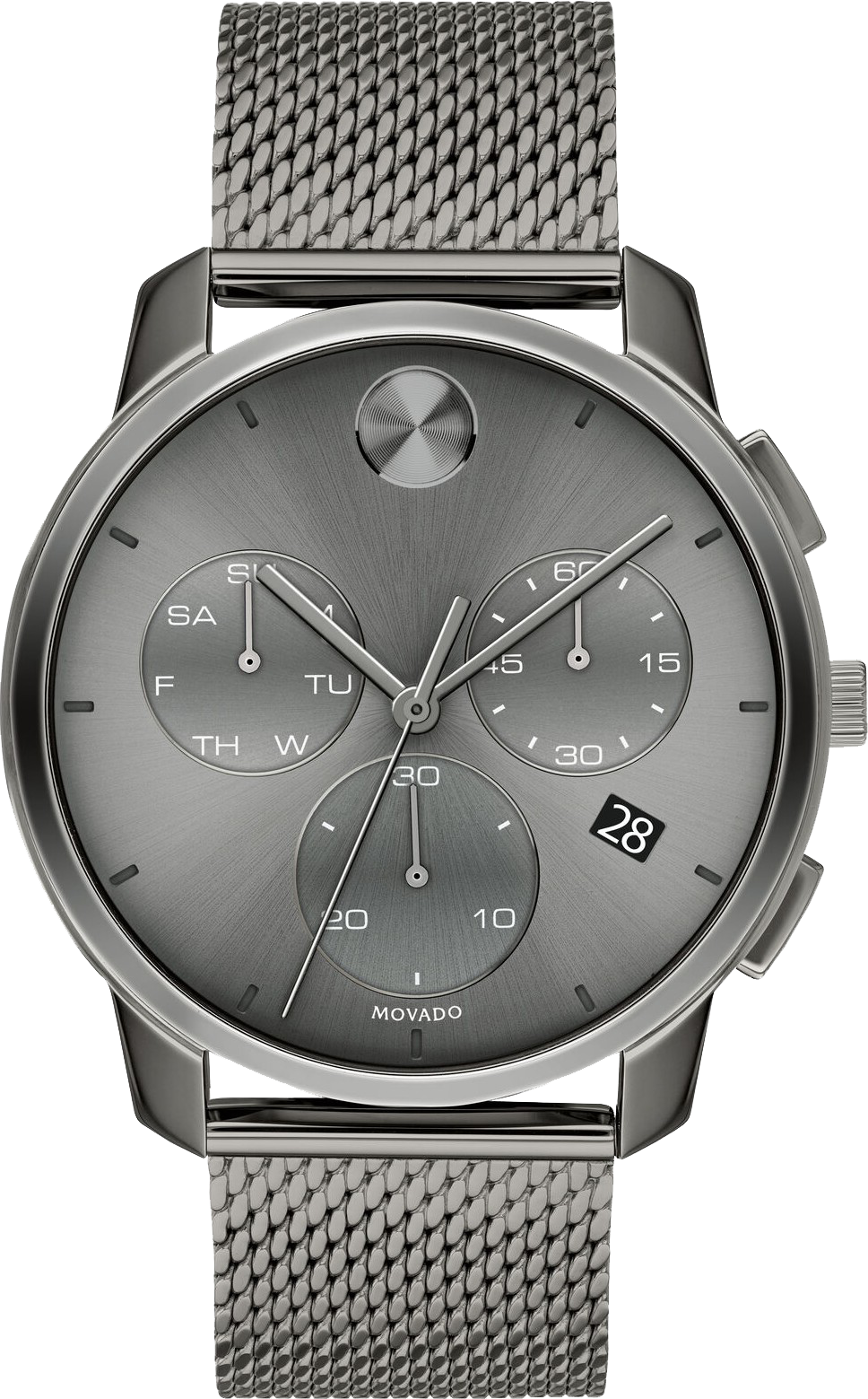 Movado đậm, vỏ bằng thép không gỉ mạ ion màu xám 42 mm và vòng đeo tay bằng lưới với mặt số đồng hồ bấm giờ màu xám.