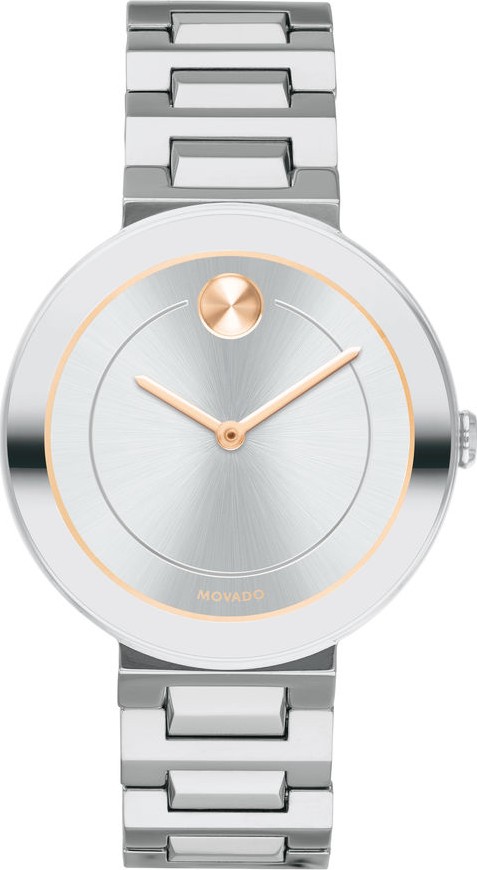 Đồng hồ Movado BÓNG cỡ trung, vỏ thép không gỉ 34 mm, pha lê K1, mặt số tông màu bạc với vòng ngoài phù hợp, chấm và kim màu hồng cẩm chướng, vòng đeo tay liên kết tinh tế bằng thép không gỉ có móc triển khai bằng nút nhấn.