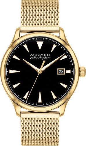 Movado Heritage Series Calendoplan, vỏ thép không gỉ mạ ion vàng vàng 40 mm với mặt số tông màu đen trên vòng đeo tay bằng thép không gỉ mạ ion vàng vàng.