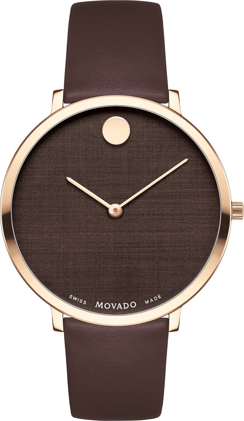 Vỏ thép không gỉ hoàn thiện PVD màu vàng hồng nhạt 47, 35 mm hiện đại với mặt số có họa tiết vải lanh màu nâu trên dây đeo bằng da màu nâu.