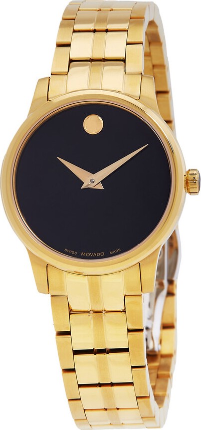 Vỏ và dây đeo bằng thép không gỉ tông vàng. Vành thép không gỉ tông vàng cố định. Mặt số màu đen với kim đồng hồ tông vàng. Không có vạch chỉ giờ. Dấu chấm Movado xuất hiện ở vị trí 12 giờ. Loại mặt số: Analog. Bộ máy thạch anh. Mặt kính sapphire chống trầy xước. Núm vặn kéo/đẩy. Nắp lưng chắc chắn. Hình dạng vỏ tròn, kích thước vỏ: 28 mm. Khóa cài. Chống nước ở độ sâu 30 mét / 100 feet. Chức năng: giờ, phút. Dòng Museum Classic. Kiểu đồng hồ thường ngày. Nhãn đồng hồ: Swiss Made.