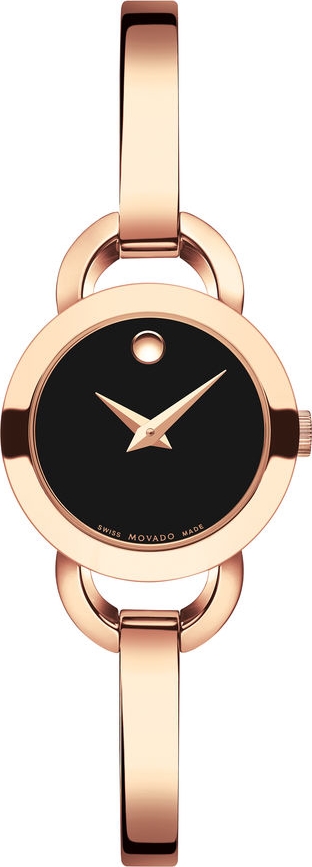Đồng hồ Rondiro dành cho nữ, vỏ thép không gỉ mạ PVD 22 mm bằng vàng hồng với vấu hình bán nguyệt mở, mặt số Museum màu đen với các chấm và kim màu vàng hồng, vòng đeo tay kiểu vòng đeo tay bằng thép không gỉ mạ PVD thanh mảnh bằng vàng hồng với các liên kết định cỡ mặt sau và móc cài trang sức .