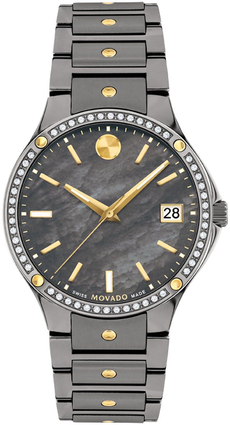Movado SE, vỏ và vòng đeo tay bằng thép không gỉ PVD màu xám vừa hoàn thiện kép 32 mm với các điểm nhấn chấm đánh bóng lõm hoàn thiện PVD vàng vàng và mặt số xà cừ màu xám. Có tinh thể Sapphire chống phản chiếu, viền chống ăn mòn, cửa sổ ngày và kim Super-LumiNova® của Thụy Sĩ, vạch chỉ giờ và chỉ số ở vị trí 6:00 và 9:00.