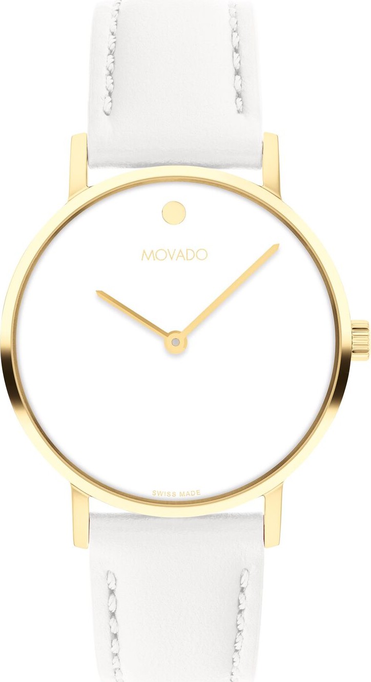 Biểu tượng của thiết kế hiện đại. Đồng hồ Movado Signature dành cho nữ, vỏ thép không gỉ mạ vàng PVD 32mm, mặt số trắng, dây da trắng, mặt kính sapphire, bộ máy thạch anh Thụy Sĩ.