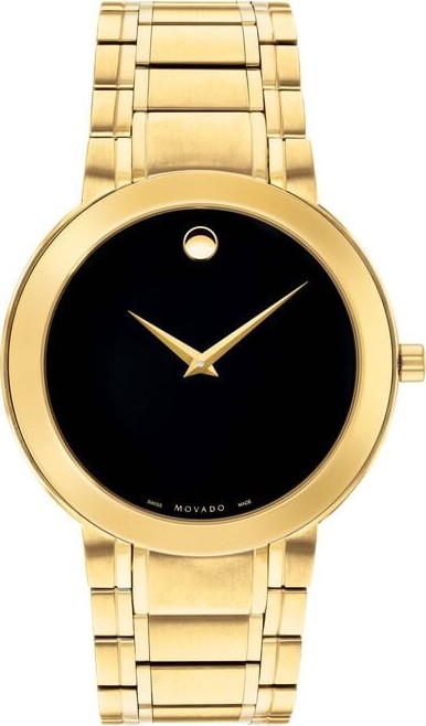Vỏ và dây đeo bằng thép không gỉ PVD vàng vàng. Viền PVD vàng vàng cố định. Mặt số màu đen với kim có tông màu vàng vàng và vạch chỉ giờ. Không có điểm đánh dấu. Dấu chấm Movado xuất hiện ở vị trí 12 giờ. Loại quay số: Analog. Chuyển động thạch anh. Tinh thể sapphire chống trầy xước. Kéo/đẩy vương miện. Vỏ sau chắc chắn. Hình dạng vỏ tròn. Kích thước vỏ: 40 mm. Độ dày vỏ: 7 mm. Chiều rộng dải: 20 mm. Chiều dài băng tần: 7 inch. Triển khai khóa bằng nút nhấn. Chống nước ở độ sâu 30 mét / 100 feet.
