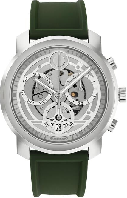 Một chiếc đồng hồ đột phá với bộ máy và độ chính xác tinh xảo được thể hiện trọn vẹn. Đồng hồ nam Movado Trend Propel, vỏ thép không gỉ 44mm và dây đeo silicon màu xanh đậm, mặt số skeleton bạc, mặt kính khoáng K1, bộ máy chronograph thạch anh. Mặt số màu xám và bạc kiểu Museum với chấm phẳng. Đường kính vỏ 44mm. Chất liệu vỏ thép không gỉ. Chất liệu kính khoáng K1. Khả năng chống nước 5 BAR. Bộ máy chronograph thạch anh. Giới tính nam. Dây đeo.