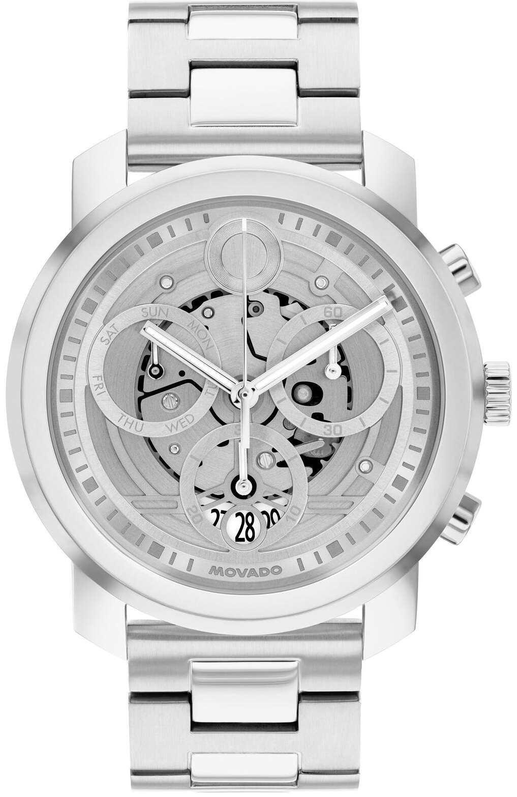 Một chiếc đồng hồ đột phá với bộ máy và độ chính xác tinh xảo được phô diễn trọn vẹn. Đồng hồ Movado Trend Propel dành cho nam, vỏ và dây đeo bằng thép không gỉ 44mm, mặt số skeleton màu bạc, khoáng K1, bộ máy Quartz Chronograph. Mặt số Museum kim loại màu bạc với các chấm phẳng. Đường kính vỏ 44. Chất liệu vỏ: thép không gỉ. Mặt kính: khoáng K1. Độ chống nước: 5 ATM. Bộ máy: Bộ máy Quartz Chronograph.