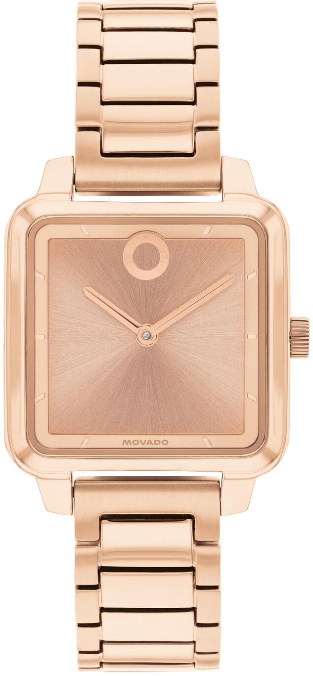 Chiếc đồng hồ bóng bẩy này tỏa sáng với thiết kế tối giản và hiện đại. Đồng hồ Movado Trend nữ hình chữ nhật, vỏ và dây đeo bằng thép vàng hồng 27mm, mặt số vàng hồng, K1 Mineral, bộ máy Quartz. Mặt số Rose Gold Museum với chấm phẳng. Đường kính vỏ 27mm. Chất liệu vỏ: Thép không gỉ mạ ion vàng hồng. Mặt kính: K1 Mineral. Độ chống nước: 3 ATM. Bộ máy: Bộ máy Quartz. Dành cho nữ. Dây đeo dạng mắt xích, dây đeo bằng thép không gỉ mạ ion vàng hồng.