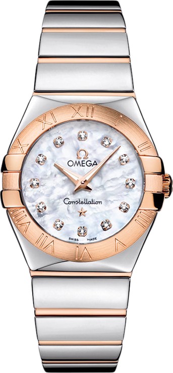 Ý tưởng thiết kế đặc biệt ấn tượng và lâu dài của dòng OMEGA Constellation được đặc trưng bởi “Griffes” hay móng vuốt nổi tiếng và mặt số nổi bật. Mẫu được đánh bóng này có mặt số xà cừ trắng được đánh dấu bằng các cọc số đính kim cương và được bao phủ bởi tinh thể sapphire chống trầy xước. Vành bezel bằng vàng đỏ 18K với các chữ số La Mã được khắc, được gắn trên thân vỏ bằng thép không gỉ 27 mm và đi kèm dây đeo bằng thép không gỉ và vàng đỏ 18K. Chiếc đồng hồ này được trang bị bộ máy calibre 1376 của OMEGA, một bộ máy thạch anh chính xác. Dây đeo: Thép - vàng đỏ. Giữa các vấu: 18 mm. Vỏ: Thép - vàng hồng. Đường kính vỏ: 27 mm. Màu quay số: Trắng. Pha lê: Tinh thể sapphire hình vòm, chống trầy xước được xử lý chống phản chiếu bên trong. Khả năng chống nước: 10 bar (100 mét / 330 feet). Cỡ nòng: Omega 1376. Chuyển động thạch anh chính xác với lớp mạ rhodium. Kiểu: Thạch anh