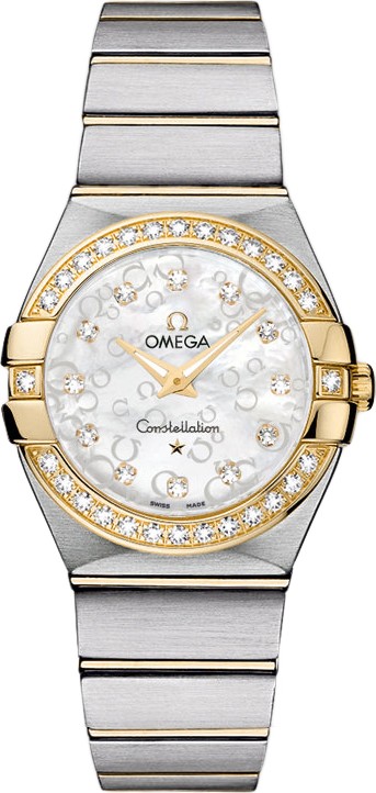 Mẫu sáng bóng này có mặt số xà cừ trắng được đánh dấu bằng các chỉ số giờ nạm kim cương, được trang trí bằng logo OMEGA theo hoa văn ngẫu nhiên và được bao phủ bởi tinh thể sapphire chống trầy xước. Vành bezel nạm kim cương bằng vàng hồng 18K được gắn trên thân vỏ bằng thép không gỉ 27 mm và được trình bày trên dây đeo bằng thép không gỉ và vàng hồng 18K.