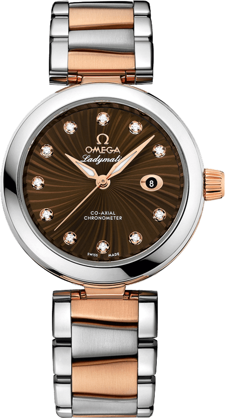 Chiếc OMEGA Ladymatic này có mặt số màu nâu được đánh dấu bằng các cọc số đính kim cương và được trang trí bằng họa tiết siêu tân tinh với cửa sổ ngày ở vị trí 3 giờ. Mặt số tinh tế có thể nhìn thấy được qua tinh thể sapphire chống trầy xước. Vỏ thép không gỉ 34 mm được đánh bóng đi kèm dây đeo hai màu được làm từ thép không gỉ và vàng đỏ 18K.