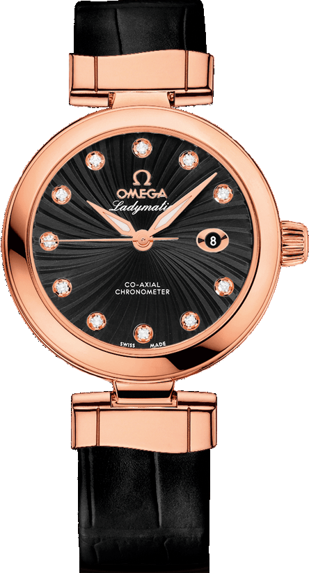 Chiếc OMEGA Ladymatic này có mặt số màu đen được đánh dấu bằng các cọc số đính kim cương và được trang trí theo mô hình siêu tân tinh với cửa sổ ngày ở vị trí 3 giờ. Mặt số tinh tế có thể được nhìn thấy qua mặt kính sapphire chống trầy xước. Vành bezel được gắn trên vỏ bằng vàng đỏ 18K đường kính 34 mm trên dây đeo bằng da màu đen.