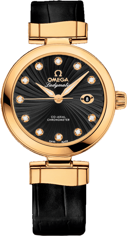 Chiếc OMEGA Ladymatic này có mặt số màu đen được đánh dấu bằng các cọc số đính kim cương và được trang trí theo mô hình siêu tân tinh với cửa sổ ngày ở vị trí 3 giờ. Mặt số tinh tế có thể nhìn thấy được qua tinh thể sapphire chống trầy xước. Vành bezel được gắn trên vỏ vàng hồng 18K đường kính 34 mm trên dây đeo bằng da màu đen.