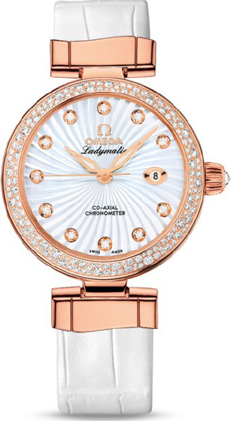 Chiếc OMEGA Ladymatic này có mặt số xà cừ trắng được đánh dấu bằng các cọc số đính kim cương và được trang trí theo mô hình siêu tân tinh với cửa sổ ngày ở vị trí 3 giờ. Mặt số tinh tế có thể được nhìn thấy qua mặt kính sapphire chống trầy xước. Vành bezel được bao phủ bởi những viên kim cương được sắp xếp theo mô hình tuyết, được gắn trên vỏ bằng vàng đỏ 18K đường kính 34 mm trên dây đeo bằng da màu trắng.