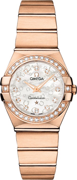 Mẫu sáng bóng này có mặt số xà cừ trắng được đánh dấu bằng các chỉ số giờ nạm kim cương, được trang trí bằng logo OMEGA theo hoa văn ngẫu nhiên và được bao phủ bởi tinh thể sapphire chống trầy xước. Vành bezel nạm kim cương được gắn trên vỏ bằng vàng đỏ 18K 24 mm và đi kèm dây đeo bằng vàng đỏ 18K.