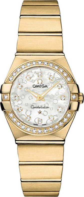 Mẫu sáng bóng này có mặt số xà cừ trắng được đánh dấu bằng các chỉ số giờ nạm kim cương, được trang trí bằng logo OMEGA theo hoa văn ngẫu nhiên và được bao phủ bởi tinh thể sapphire chống trầy xước. Vành bezel nạm kim cương được gắn trên vỏ bằng vàng hồng 18K 24 mm và đi kèm dây đeo bằng vàng hồng 18K.