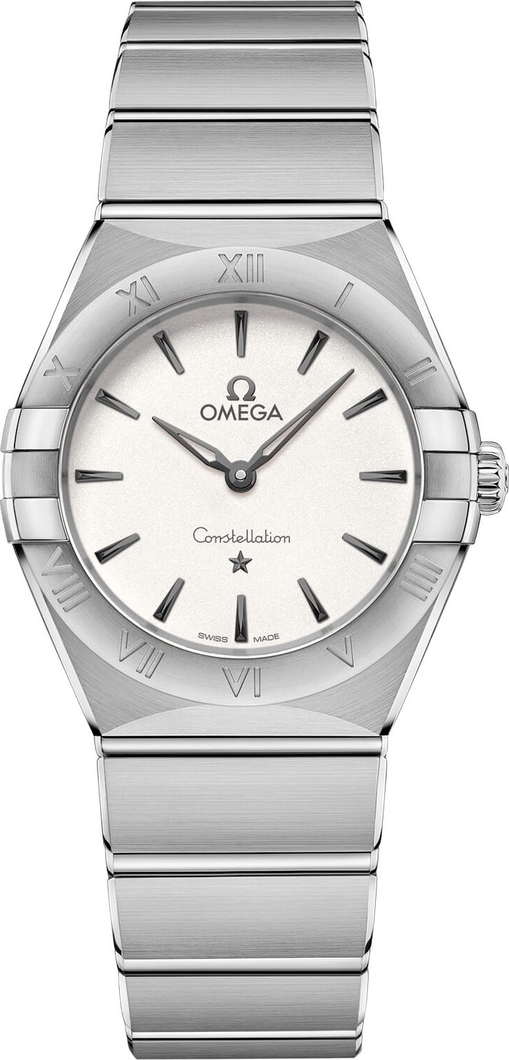 Thiết kế ấn tượng và bền bỉ của OMEGA Constellation được đặc trưng bởi hình bán nguyệt nổi tiếng, “móng vuốt” trên vỏ và dây đeo đơn sắc. Mẫu đồng hồ thép không gỉ 28 mm này có vành bezel khắc chữ số La Mã, mặt số màu trắng bạc và tinh thể saphire chống trầy xước. Kim đồng hồ đen, logo OMEGA, ngôi sao Constellation và các vạch chỉ giờ tương phản tuyệt đẹp với mặt số trắng. Trái tim của chiếc đồng hồ này là bộ máy OMEGA Calibre 4061, trong khi nắp lưng được đóng dấu huy chương Đài quan sát Chòm sao. Khoảng cách giữa các vấu 17,5 mm. Khoảng cách từ vấu này đến vấu kia 30,50 mm. Độ dày 8,48 mm. Đường kính vỏ 28 mm. Vỏ thép. Màu mặt số: Bạc. Mặt kính: Tinh thể sapphire chống xước hình vòm, được xử lý chống phản quang ở cả hai mặt. Khả năng chống nước: 3 bar (30 mét / 100 feet). Tổng trọng lượng sản phẩm (xấp xỉ): 84 g. Cỡ máy: Omega 4061. Loại máy: Thạch anh