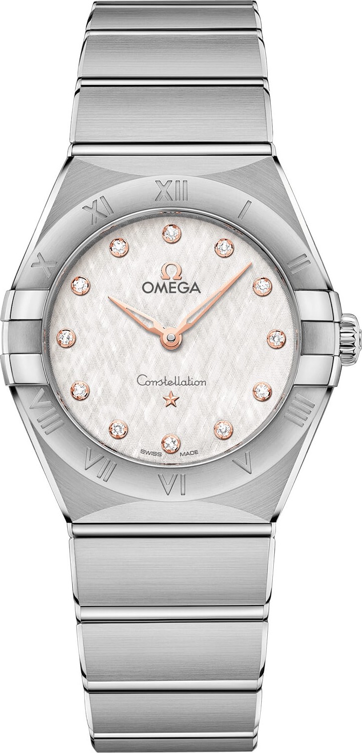 Thiết kế ấn tượng và bền bỉ của OMEGA Constellation được đặc trưng bởi hình bán nguyệt nổi tiếng, “móng vuốt” trên vỏ và dây đeo đơn sắc. Mẫu đồng hồ thép không gỉ 28 mm này có vành được khắc số La Mã, mặt số màu bạc kem với họa tiết giống như lụa và mặt kính sapphire chống trầy xước. Kim, logo OMEGA, ngôi sao Constellation và các giá đỡ kim cương được làm bằng vàng Sedna™ 18K. Trái tim của chiếc đồng hồ này là bộ máy OMEGA Calibre 4061, trong khi mặt sau được đóng dấu huy chương Đài quan sát Chòm sao. Khoảng cách giữa các vấu là 17,5 mm. Khoảng cách từ vấu này đến vấu kia là 30,50 mm. Độ dày 8,48 mm. Đường kính vỏ 28 mm. Vỏ thép. Màu mặt số là bạc. Mặt kính: Tinh thể sapphire hình vòm chống xước với lớp phủ chống phản quang ở cả hai mặt. Khả năng chống nước 3 bar (30 mét / 100 feet). Tổng trọng lượng sản phẩm (xấp xỉ) 83 g. Bộ máy Omega 4061. Loại chuyển động: Thạch anh