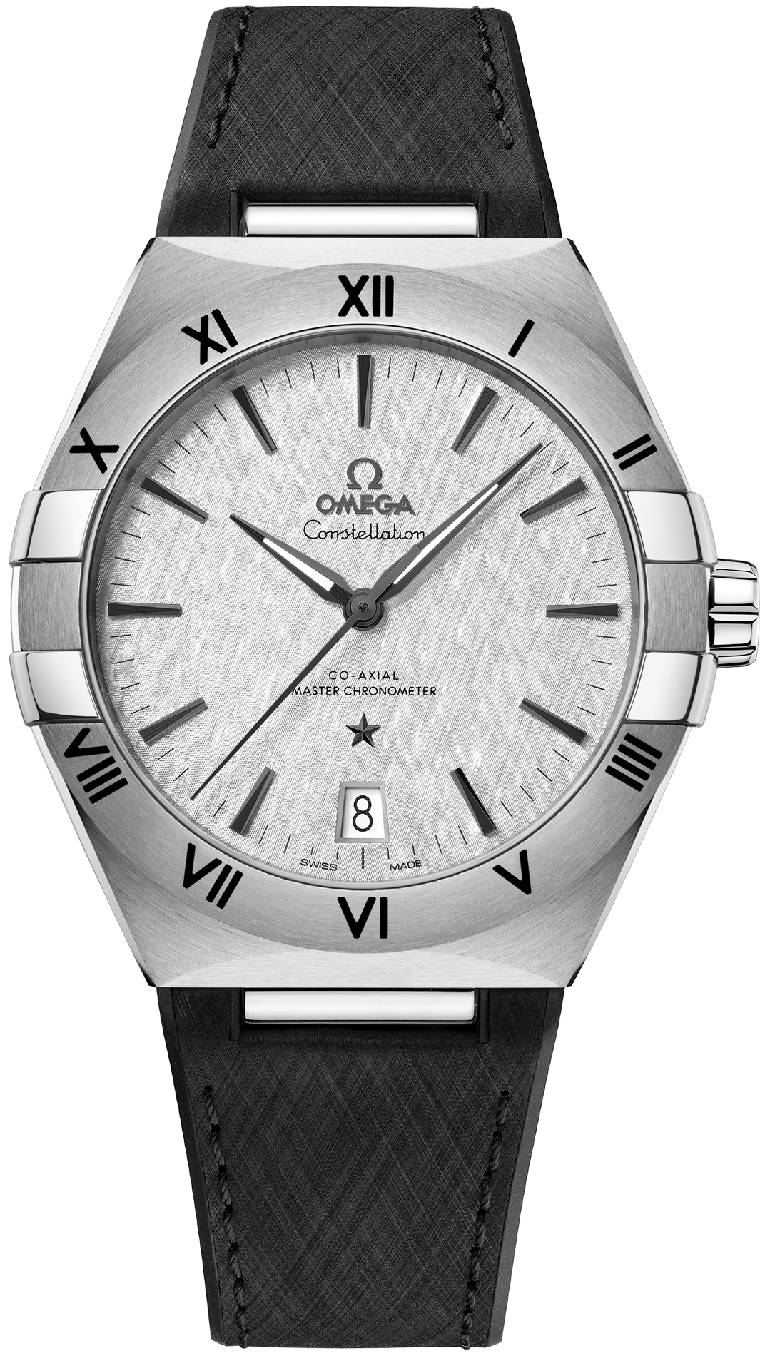 Mẫu thép không gỉ 41 mm này có các chữ số La Mã màu trên viền, mặt số màu xám Rhodium dập nổi bằng lụa và cửa sổ ngày ở vị trí 6 giờ. Các kim, Logo Omega, Ngôi sao Chòm sao và các chỉ số mặt đều được làm đen.