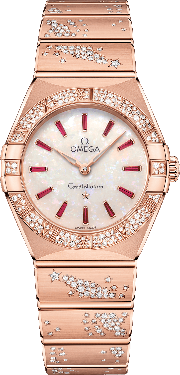 Xung quanh cổ tay, chiếc vòng tay bằng vàng sedna™ 18k được đính 192 viên kim cương cắt sáng chói và bốn viên kim cương “cắt ngôi sao” theo chòm sao – tất cả đều được sắp xếp theo mô hình ngôi sao băng. Trung tâm của chiếc đồng hồ này là bộ máy omega calibre 4061, được đặt phía sau một huy chương quan sát omega ở mặt sau.