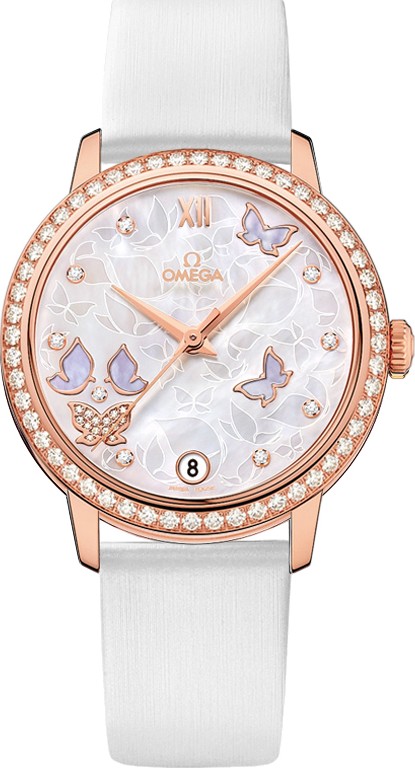 Mặt kính sapphire chống xước bảo vệ mặt số ấn tượng này. Vành bezel nạm kim cương được gắn trên vỏ bằng vàng đỏ 18K đường kính 32,7 mm và đi kèm dây đeo bằng da satin màu trắng có hiệu ứng xà cừ. Trung tâm của chiếc đồng hồ này là bộ máy Co-Axial 2500.