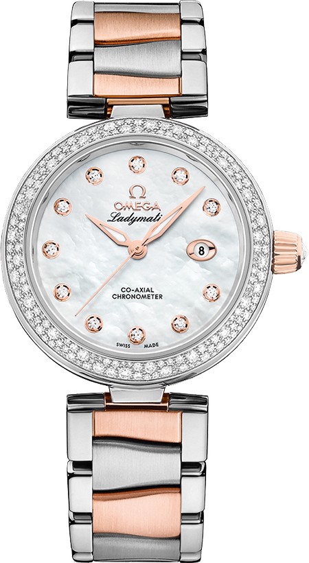 Khi Ladymatic xuất hiện lần đầu tiên vào năm 1955, nó đã trở thành chiếc đồng hồ đặc trưng trong thời trang phụ nữ. Sáu thập kỷ trôi qua, nó vẫn giữ được từng chút phong cách và sự duyên dáng quyến rũ. Ở mẫu này, vỏ thép không gỉ được tăng cường nhờ dây đeo kim loại sáng bóng với các cạnh gợn sóng, được chế tác từ vàng Sedna™ 18K và thép không gỉ. Vàng Sedna™ còn nổi bật trên các kim hình chữ alpha được đánh bóng cũng như 11 chỉ số được đính kim cương. Tỏa sáng xung quanh mặt số xà cừ trắng, viền đồng hồ cũng được lát bằng những viên kim cương tuyết và một viên kim cương bổ sung "Brilliant OMEGA cut" được đặt bên trong núm vặn được đánh bóng. Ngày được theo dõi bởi một cửa sổ ngày ở vị trí 3 giờ, trong khi phần thân bên trong bao gồm bộ máy OMEGA Co-Axial calibre 8520. Dây đeo: Thép - Vàng Sedna™. Giữa các vấu: 16 mm. Vỏ: Thép - Vàng Sedna™. Đường kính vỏ: 34 mm. Màu quay số: Trắng. Pha lê: Tinh thể sapphire hình vòm chống trầy xước được xử lý chống phản chiếu ở cả hai mặt. Khả năng chống nước: 10 bar (100 mét / 330 feet)