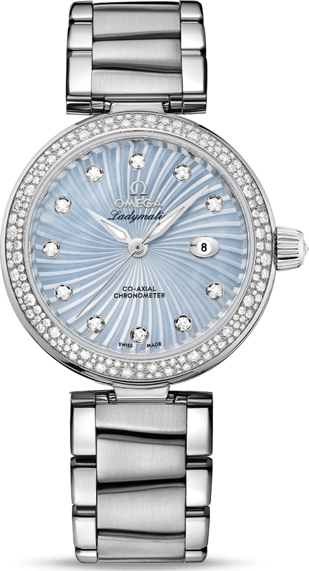 Chiếc OMEGA Ladymatic này có mặt số xà cừ màu xanh lam được đánh dấu bằng các cọc số đính kim cương và được trang trí theo mô hình siêu tân tinh với cửa sổ ngày ở vị trí 3 giờ. Mặt số tinh tế có thể nhìn thấy được qua tinh thể sapphire chống trầy xước. Vành bezel nạm kim cương được gắn trên vỏ thép không gỉ 34 mm trên dây đeo bằng thép không gỉ.