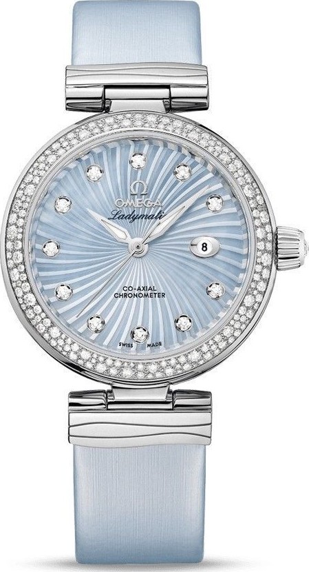 Chiếc OMEGA Ladymatic này có mặt số xà cừ màu xanh lam được đánh dấu bằng các cọc số đính kim cương và được trang trí theo mô hình siêu tân tinh với cửa sổ ngày ở vị trí 3 giờ. Mặt số tinh tế có thể được nhìn thấy qua mặt kính sapphire chống trầy xước. Vành bezel nạm kim cương được gắn trên vỏ thép không gỉ 34 mm trên dây đeo bằng da satin màu xanh lam.