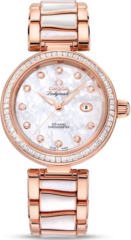 Chiếc OMEGA Ladymatic này có mặt số xà cừ với 11 vạch chỉ giờ bằng kim cương cắt đơn. Mặt số tinh tế có thể được nhìn thấy qua mặt kính sapphire chống trầy xước. Viền được trang trí bằng 60 viên kim cương cắt baguette và được gắn trên vỏ bằng vàng Sedna™ 34 mm 18K.