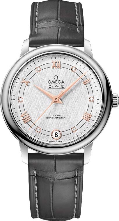 Chiếc De Ville Prestige này được trang bị dây đeo bằng da màu xám và được trang bị bộ máy OMEGA Co-Axial Chronometer Calibre 2500.