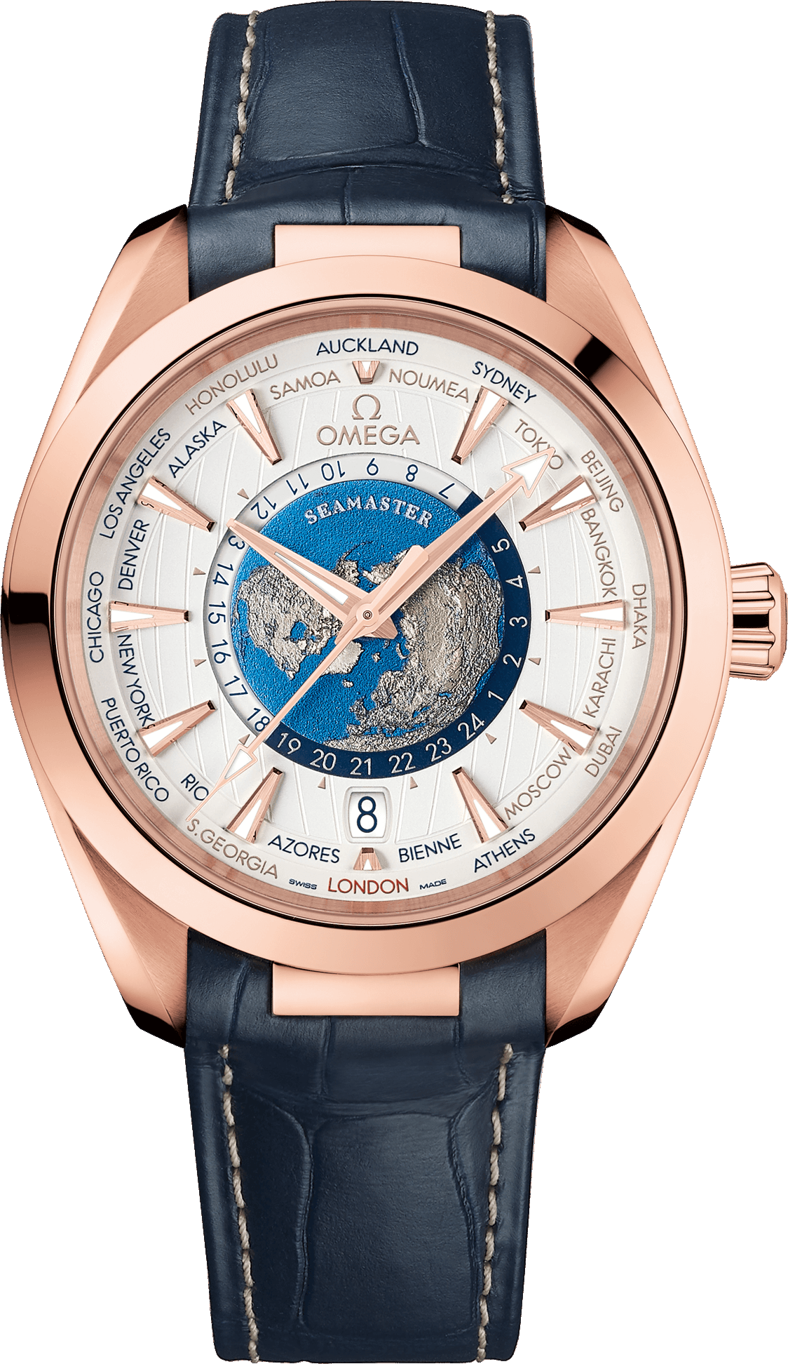 Mẫu Worldtimer 43 mm này có vỏ được đánh bóng bằng vàng Sedna™ 18K, được tích hợp với dây đeo bằng da màu xanh thông qua một mắt xích bằng vàng nguyên khối được đánh bóng. Vàng 18K Sedna™ cũng được sử dụng cho kim và cọc số.
