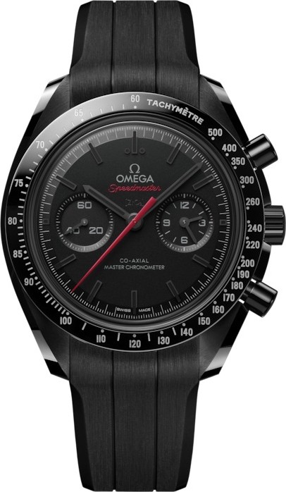 Tôn vinh di sản thám hiểm không gian của OMEGA, Speedmaster Dark Side of the Moon này có vỏ 44,25 mm bằng gốm đen đánh bóng chải xước. Vành bezel đánh bóng cũng được làm từ gốm đen và có thang đo tốc độ bằng Liquidmetal™. Bên dưới tinh thể sapphire phía trước, mặt số bằng gốm đã được phun cát bằng tia laser và bao gồm màn hình hiển thị giây nhỏ ở vị trí 9H và máy ghi 60 phút và 12 giờ ở vị trí 3H. Kim giờ và kim phút, cũng như các vạch chỉ giờ vát, đều được phủ đen và phủ Super-LumiNova màu đen (phát xạ màu xanh lá cây). Kim chronograph trung tâm được đánh vecni màu đỏ để có vẻ ngoài đặc biệt. Có thể nhìn thấy qua mặt sau của vỏ, bộ máy Co-Axial Master Chronometer Calibre 9908 lên dây cót bằng tay của OMEGA đã được hoàn thiện "phiên bản đen" đặc biệt, bao gồm tấm chính và cầu nối được đánh đen mờ, cũng như các họa tiết khắc vecni màu đen. Đồng hồ được đeo trên dây đeo cao su màu đen có họa tiết bề mặt mặt trăng ở mặt dưới, khóa gập bằng gốm và khung lò xo bằng titan phủ gốm. Khoảng cách giữa các vấu là 21 mm. Khoảng cách từ vấu này đến vấu kia là 50,00 mm. Độ dày 13,02 mm. Đường kính vỏ 44,25 mm. Vỏ bằng gốm đen. Màu mặt số Đen. Pha lê: Mặt kính sapphire chống xước được phủ lớp chống phản quang ở cả hai mặt. Khả năng chống nước 5 bar (50 mét / 165 feet). Tổng trọng lượng sản phẩm (xấp xỉ) 102 g. Bộ máy: OMEGA 9908 Black Edition. Kiểu chuyển động: Lên dây cót bằng tay. Dự trữ năng lượng 60 giờ. Màu dây đeo: Đen. Kiểu dây đeo: Dây cao su. Bề mặt dây đeo: Cao su. Mặt dưới dây đeo: Cao su. Kiểu khóa: Khóa gập. Chất liệu khóa: Gốm