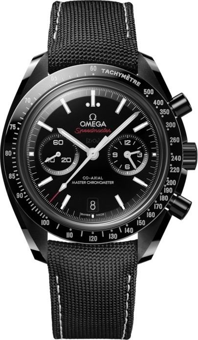 Tôn vinh di sản thám hiểm không gian của OMEGA, chiếc Speedmaster Dark Side of the Moon này có vỏ 44,25 mm bằng gốm đen đánh bóng chải xước. Vành bezel đánh bóng cũng được làm từ gốm đen và có thang đo tốc độ bằng Liquidmetal™. Bên dưới tinh thể sapphire phía trước, mặt số gốm đánh bóng bao gồm màn hình hiển thị giây nhỏ ở vị trí 9H, máy ghi 60 phút và 12 giờ ở vị trí 3H và cửa sổ ngày ở vị trí 6H. Kim giờ và kim phút, cũng như các vạch chỉ giờ vát và kim phụ trên mặt số, đều được làm từ vàng trắng 18K và được phủ lớp Super-LumiNova màu xanh lá cây nhạt (phát quang màu xanh lá cây). Kim chronograph trung tâm được mạ vàng trắng PVD và để lộ đầu màu đỏ. Được trang bị bộ máy Co-Axial Master Chronometer Calibre 9900 tự lên dây cót của OMEGA, chiếc đồng hồ táo bạo này được hoàn thiện bằng dây đeo bằng vải nylon màu đen có lớp lót cao su màu đen, khóa gập bằng gốm và khung lò xo bằng titan tráng men. Khoảng cách giữa các vấu 21 mm. Khoảng cách từ vấu này đến vấu kia 50,00 mm. Độ dày 15,09 mm. Đường kính vỏ 44,25 mm. Vỏ gốm đen. Màu mặt số Đen. Mặt kính: Tinh thể sapphire chống xước, phủ lớp chống phản quang ở cả hai mặt. Khả năng chống nước 5 bar (50 mét / 165 feet). Bộ máy: Omega 9900. Kiểu máy: Tự lên dây cót. Dự trữ năng lượng: 60 giờ. Màu dây: Đen. Kiểu dây: Dây đeo bằng vải nylon tráng. Bề mặt dây: Vải gia cố. Mặt dưới dây: Cao su. Kiểu khóa: Khóa gập. Chất liệu khóa: Gốm