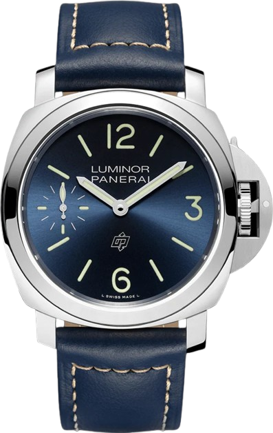 Vỏ thép không gỉ với dây đeo da màu xanh lam. Vòng bezel cố định bằng thép không gỉ. Mặt số màu xanh lam với các vạch chỉ giờ bằng chữ số. Chữ số Ả Rập xuất hiện ở vị trí 3, 6 và 12 giờ. Loại mặt số: Analog. Mặt số phụ hiển thị giây nhỏ. Bộ máy Panerai calibre P.6000 lên dây cót bằng tay, chứa 19 chân kính, tần số dao động 21600 vph, và có khả năng dự trữ năng lượng khoảng 72 giờ. Mặt kính sapphire chống trầy xước. Nắp lưng kín. Kích thước vỏ: 44 mm. Độ dày vỏ: 13,05 mm. Khóa cài dạng ghim. Chống nước ở độ sâu 100 mét / 330 feet.