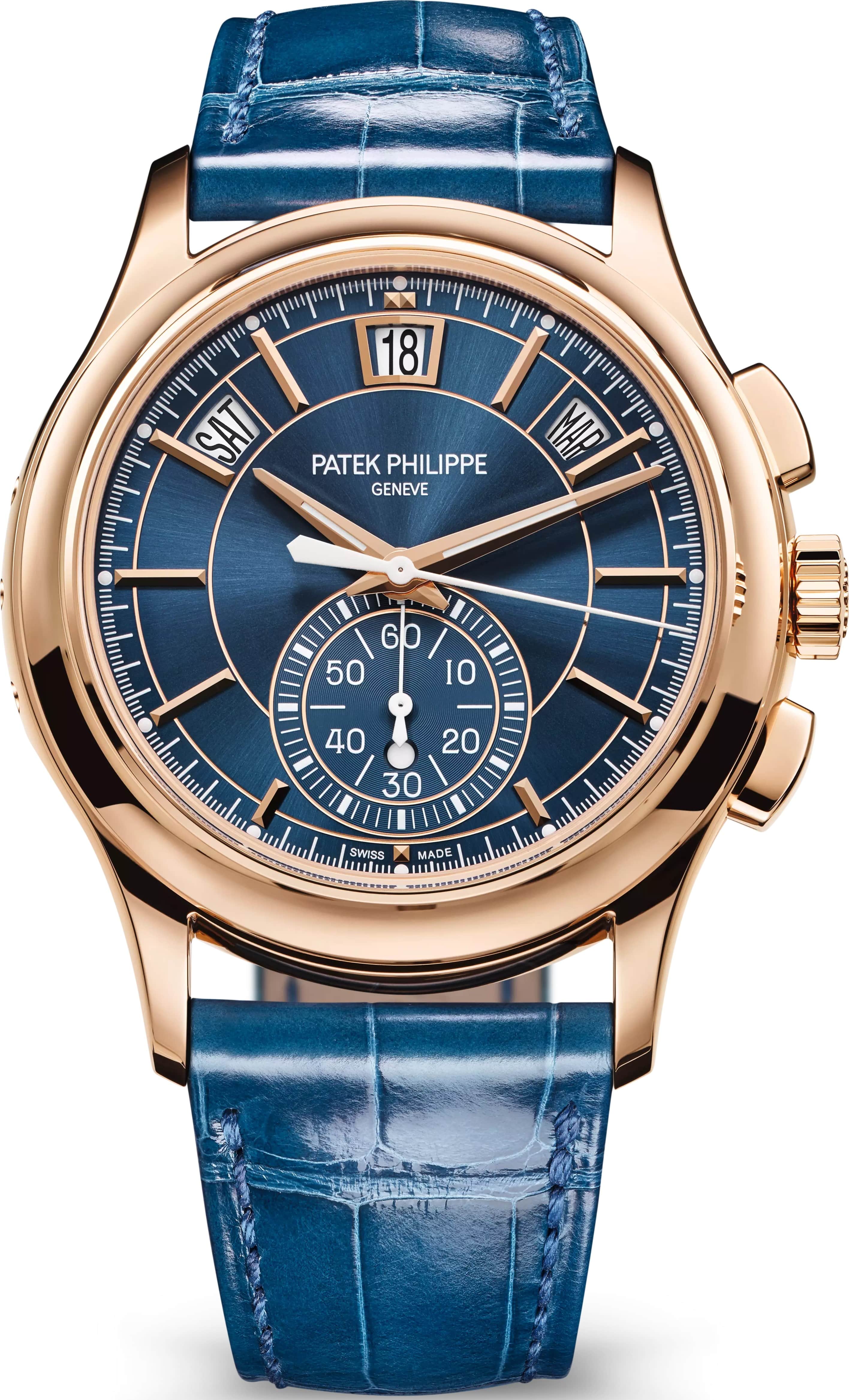 Sự kết hợp của hai chức năng phức tạp được săn đón nhất của Patek Philippe, chiếc đồng hồ bấm giờ tự động flyback với Lịch Hàng năm Tham chiếu 5905 được cung cấp trong phiên bản vàng hồng với mặt số màu xanh lam chải tia – một màu sắc hiện đại, thanh lịch làm nổi bật phong cách vượt thời gian của mẫu đồng hồ chủ lực này. Lịch Hàng năm chỉ cần điều chỉnh một lần mỗi năm, vào cuối tháng Hai. Mặt số: Màu xanh lam chải tia, các vạch chỉ giờ hình chữ nhật bằng vàng hồng được gắn nổi. Kim giờ và kim phút hình mũi tên kiểu dauphine bằng vàng hồng được phủ lớp phát quang màu trắng. Vỏ: Vàng hồng. Đường kính: 42 mm. Độ dày: 14,03 mm. Chống nước đến 30m. Mặt sau bằng kính sapphire. Dây đeo: Da cá sấu vảy vuông, khâu tay, màu xanh đậm bóng. Khóa cài bằng vàng hồng. Bộ máy: CH 28-520 QA 24H; Tự động; Bấm giờ flyback; Kim bấm giờ trung tâm; Bộ đếm 60 phút; Lịch Hàng năm; Hiển thị ngày, tháng, năm và ngày/đêm trong ô cửa sổ; Đường kính: 33 mm. Độ dày: 7,68 mm. Số chi tiết: 402. Số chân kính: 37. Thời gian dự trữ năng lượng: tối thiểu 45 giờ – tối đa 55 giờ. Bộ máy lên dây: Rôto trung tâm bằng vàng 21K. Gyromax®. Tần số: 28.800 dao động bán phần/giờ (4 Hz). Lò xo cân bằng: Spiromax®. Dấu hiệu đặc trưng: Con dấu Patek Philippe.