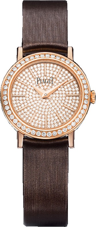 Đồng hồ Piaget Altiplano, 24 mm. Vỏ bằng vàng hồng 18K được đính 48 viên kim cương cắt sáng chói (khoảng 0,4 ct). Bộ mặt số nạm 180 viên kim cương cắt sáng chói (khoảng 0,6 ct) với vạch chỉ giờ bằng vàng hồng 18K. Bộ khóa được đính 13 viên kim cương cắt sáng chói (khoảng 0,04 ct). Bộ máy thạch anh Piaget 690P.