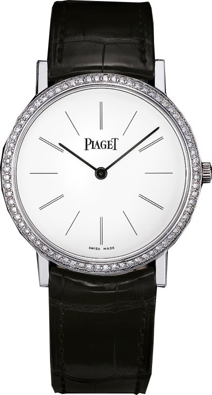 Đồng hồ Piaget Altiplano, 38 mm. Vỏ bằng vàng trắng 18K đính 78 viên kim cương cắt sáng chói (khoảng 0,7 ct). Chế tạo bộ máy cơ lên cót tay siêu mỏng Piaget 430P.